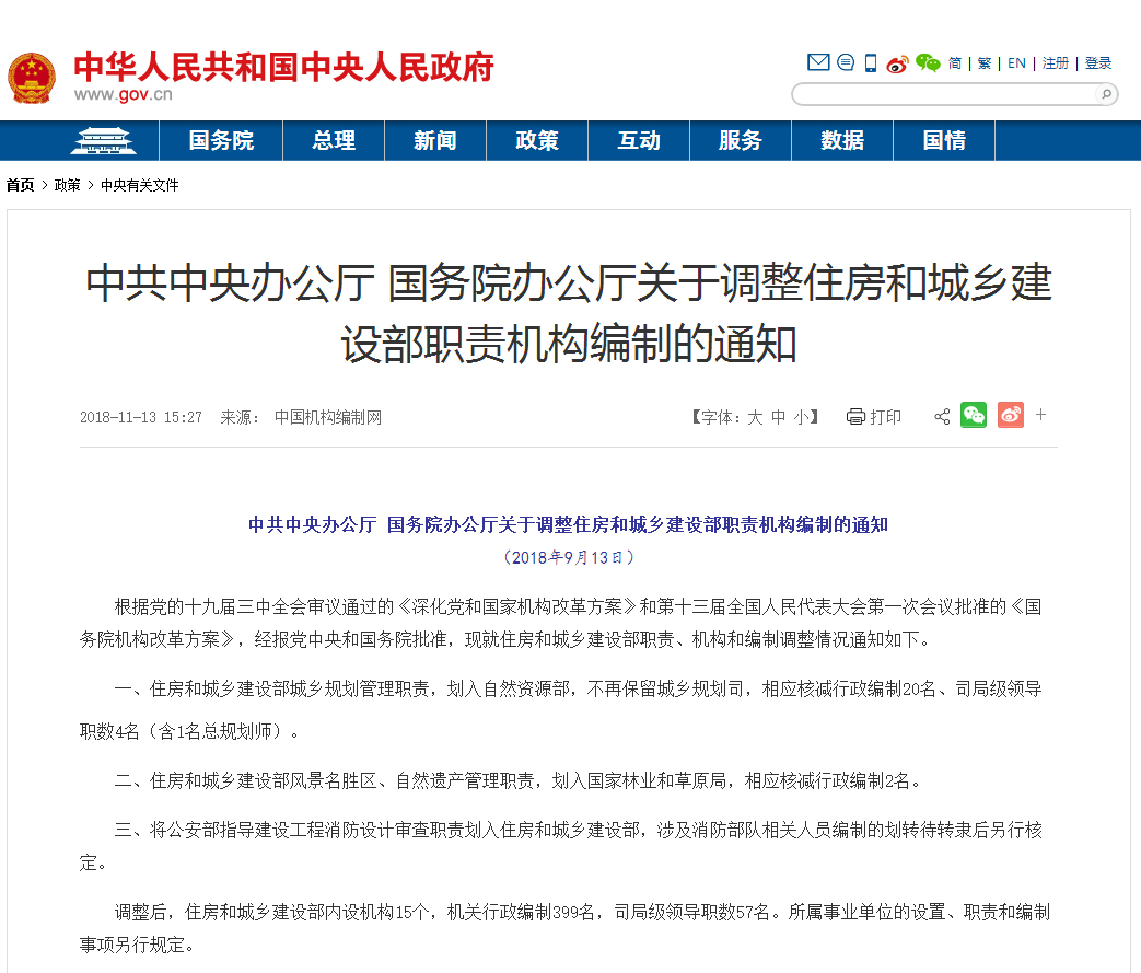 2018年11月13日中国政府网官网公布“中共中央办公厅 国务院办公厅关于调整住房和城乡建设部职责机构编制的通知”,将公安部指导建设工程消防设计审查职责划入住房和城乡建设部,涉及消防部队相关人员编制的划转待转隶后另行核定。
