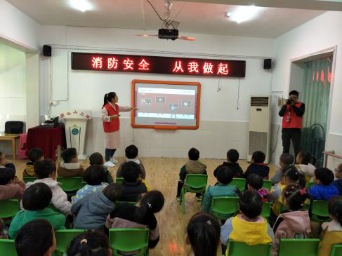 志愿者们根据幼儿年龄小、理解能力较弱的特点,利用卡通图片及简洁易懂的小儿歌,就火灾的危害性、119报警注意事项、疏散逃生要点及灭火器使用方法等消防安全常识进行了详细讲解。